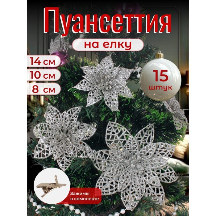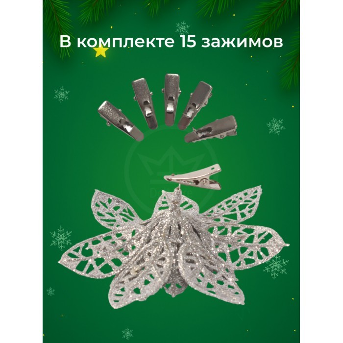 Набор Цветы Пуансеттия (15 штук - 8см-5шт/10см-5шт/14см--5шт+зажимы 15шт) серебро 266225